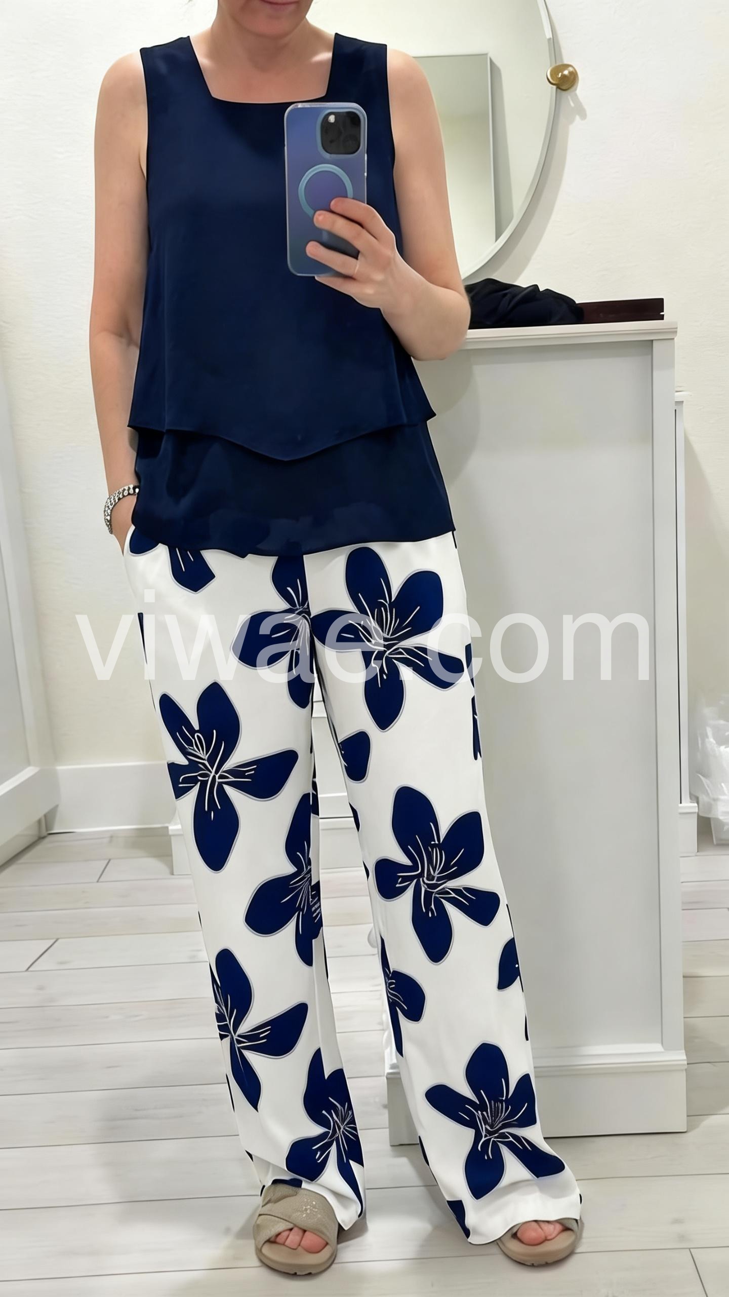 This coordinated set features a navy sleeveless top with a layered hem and wide-leg pants in white with bold navy floral prints. Comfortable and stylish for casual outings or summer days. Lightweight fabric ensures ease of movement. Perfect for beachside looks or relaxed weekends. Effortlessly chic with a modern touch.