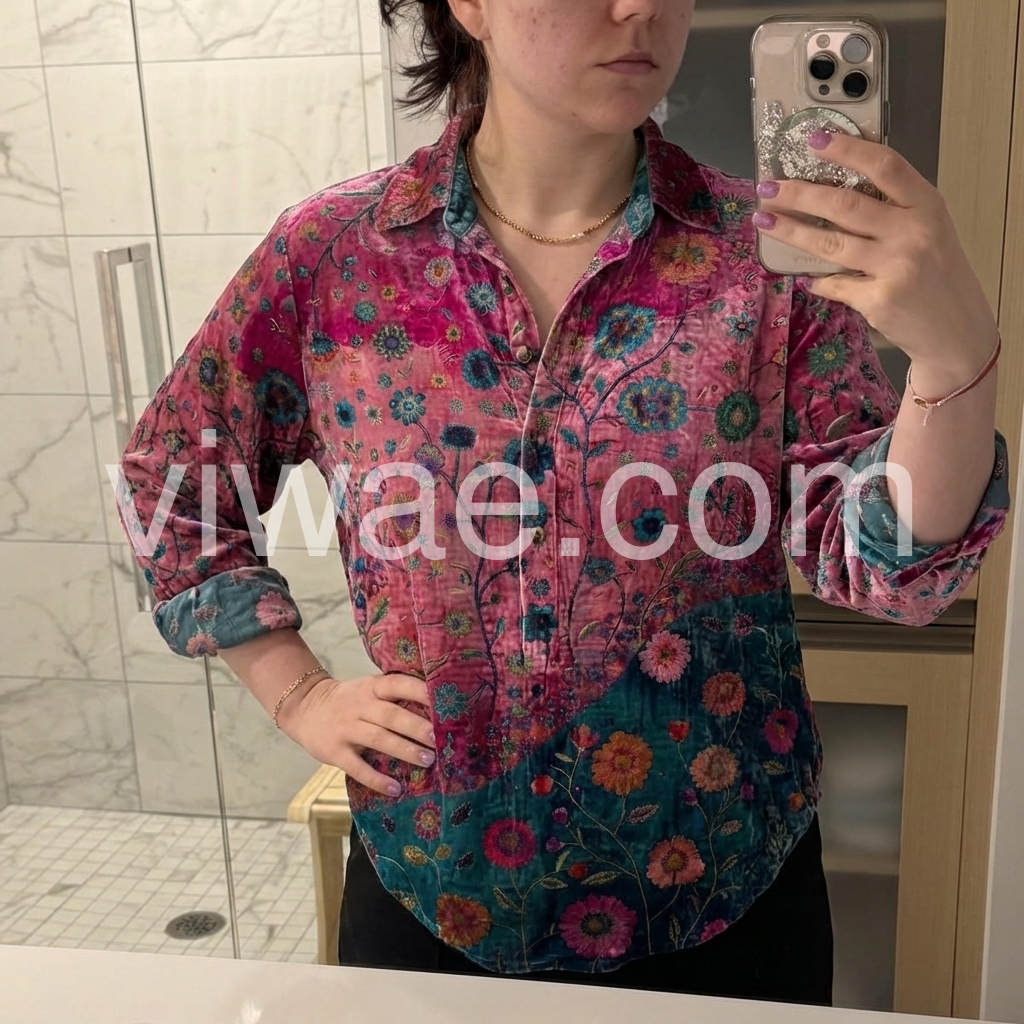 This long-sleeve shirt features a colorful floral print with a bold purple and teal color block design. The relaxed fit and classic collar offer effortless style. Perfect for pairing with jeans or denim shorts. Ideal for bohemian-inspired looks. Lightweight and eye-catching for casual days.