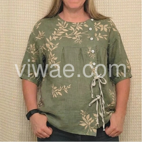 This loose-fit top features a soft olive green base with delicate leaf patterns. Front button-down design and side ties add a stylish touch. Short sleeves with rolled cuffs for comfort. Lightweight fabric perfect for casual wear. Effortlessly chic with a boho-vibe.