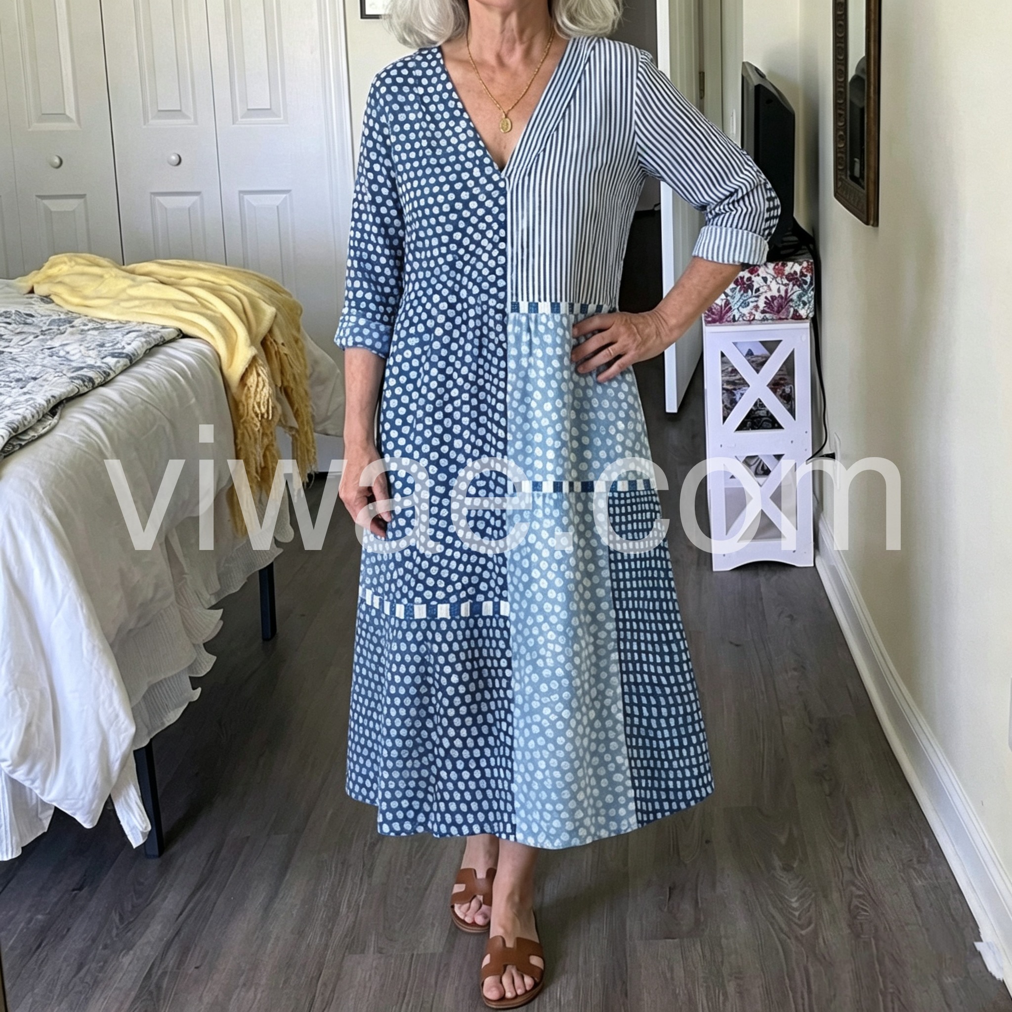 I was pleasantly surprised by the quality of this dress. It is incredibly comfortable and the V-neck is very flattering. The patchwork design of different blue patterns makes it stand out. I paired it with sandals and a straw hat for a weekend outing. Highly recommend!