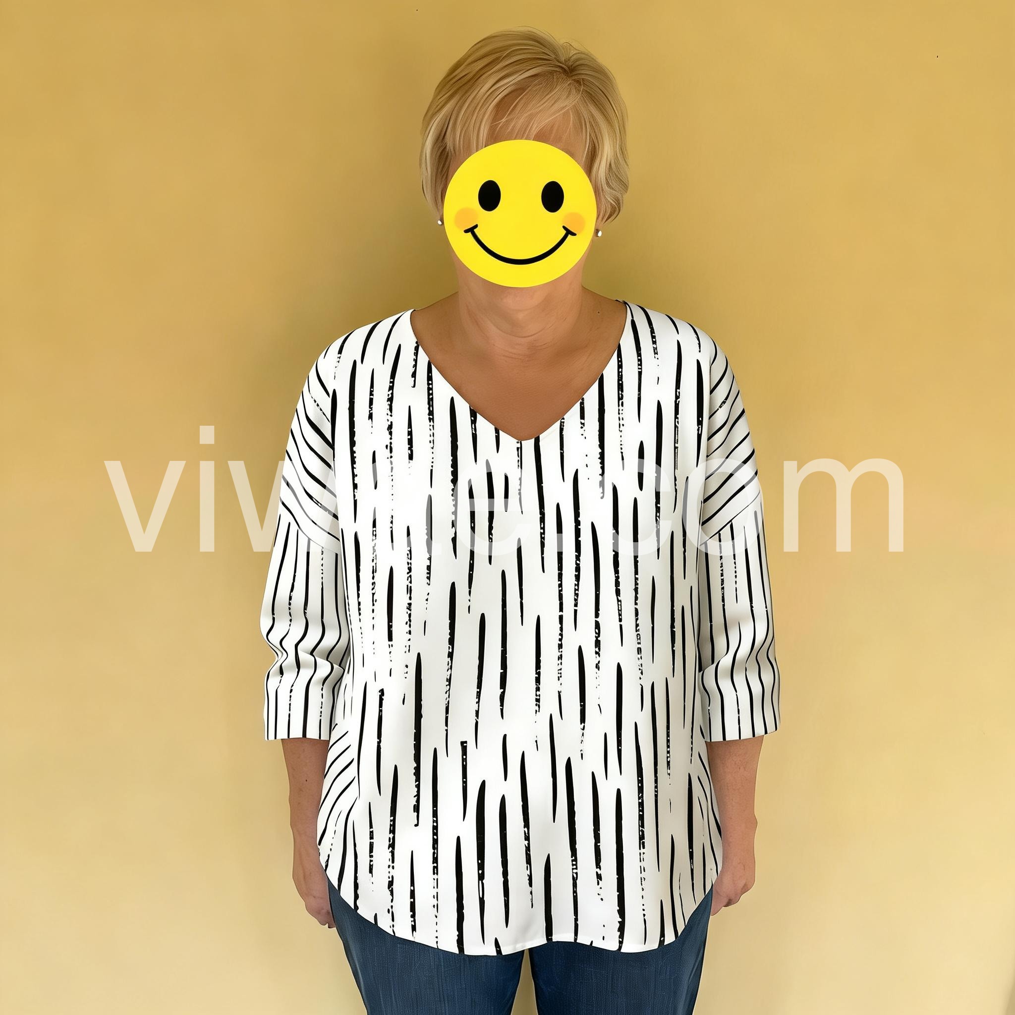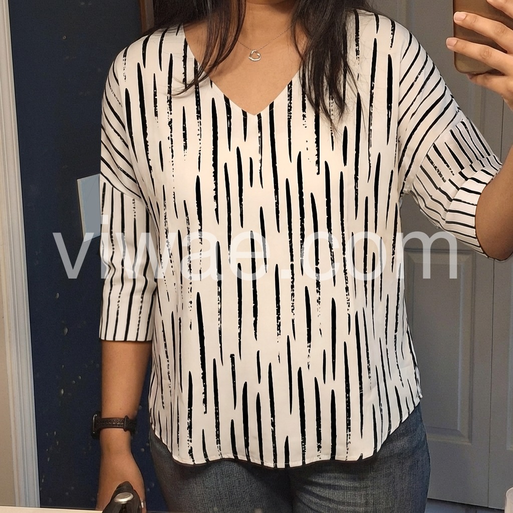 This loose-fit blouse features a bold black abstract stripe print on a white base. Deep V-neckline and three-quarter sleeves with rolled cuffs. Lightweight fabric for comfort and style. Perfect for casual wear or relaxed outings. Stylish and easy to pair with jeans or pants.
