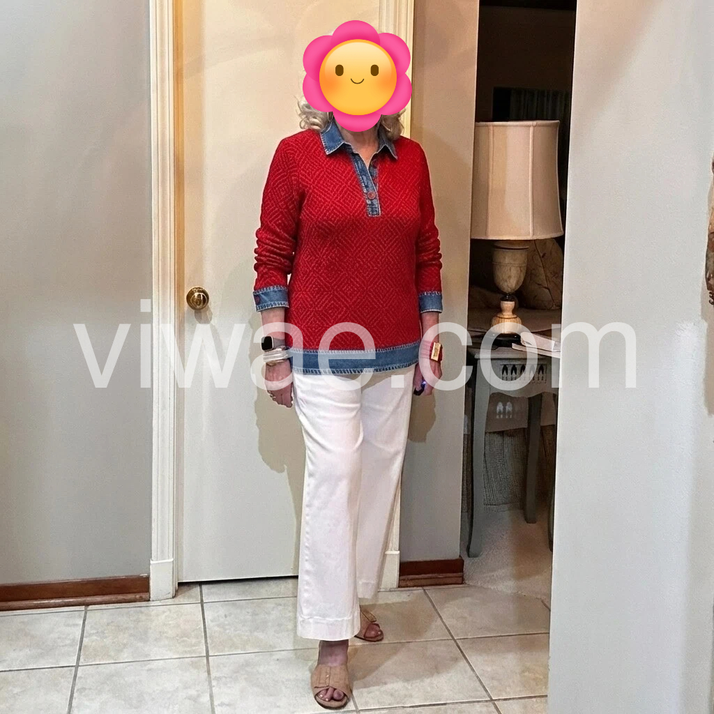 I can’t stop wearing this top! The textured red knit is cozy and durable, and the denim collar and hem add a fun, rugged charm. The red buttons are a nice touch, and the fit is true to size. It washes well too—no fading or shrinking after multiple wears. Definitely worth every penny!