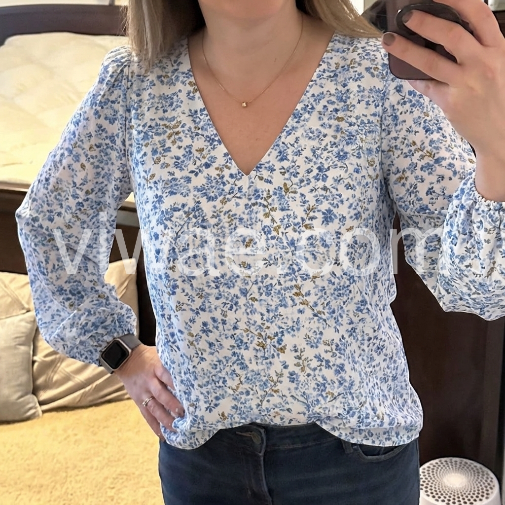 This V-neck top features a delicate blue floral print on a soft white base. Long puff sleeves with gathered cuffs add feminine flair. Lightweight fabric perfect for spring and summer. Pair with jeans or high-waisted pants for a stylish look. Effortlessly elegant with vintage charm.