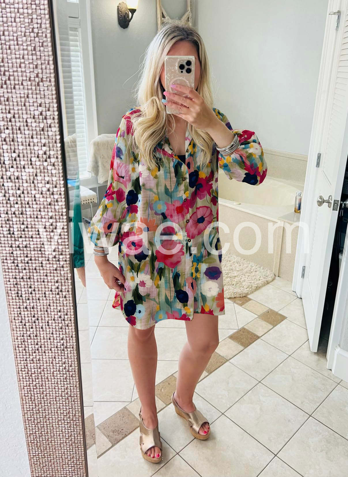 I am obsessed with the painterly floral design. It is flowy, fun, and very forgiving. The quality exceeded my expectations for the price. It drapes beautifully and the buttons feel secure. Love it!