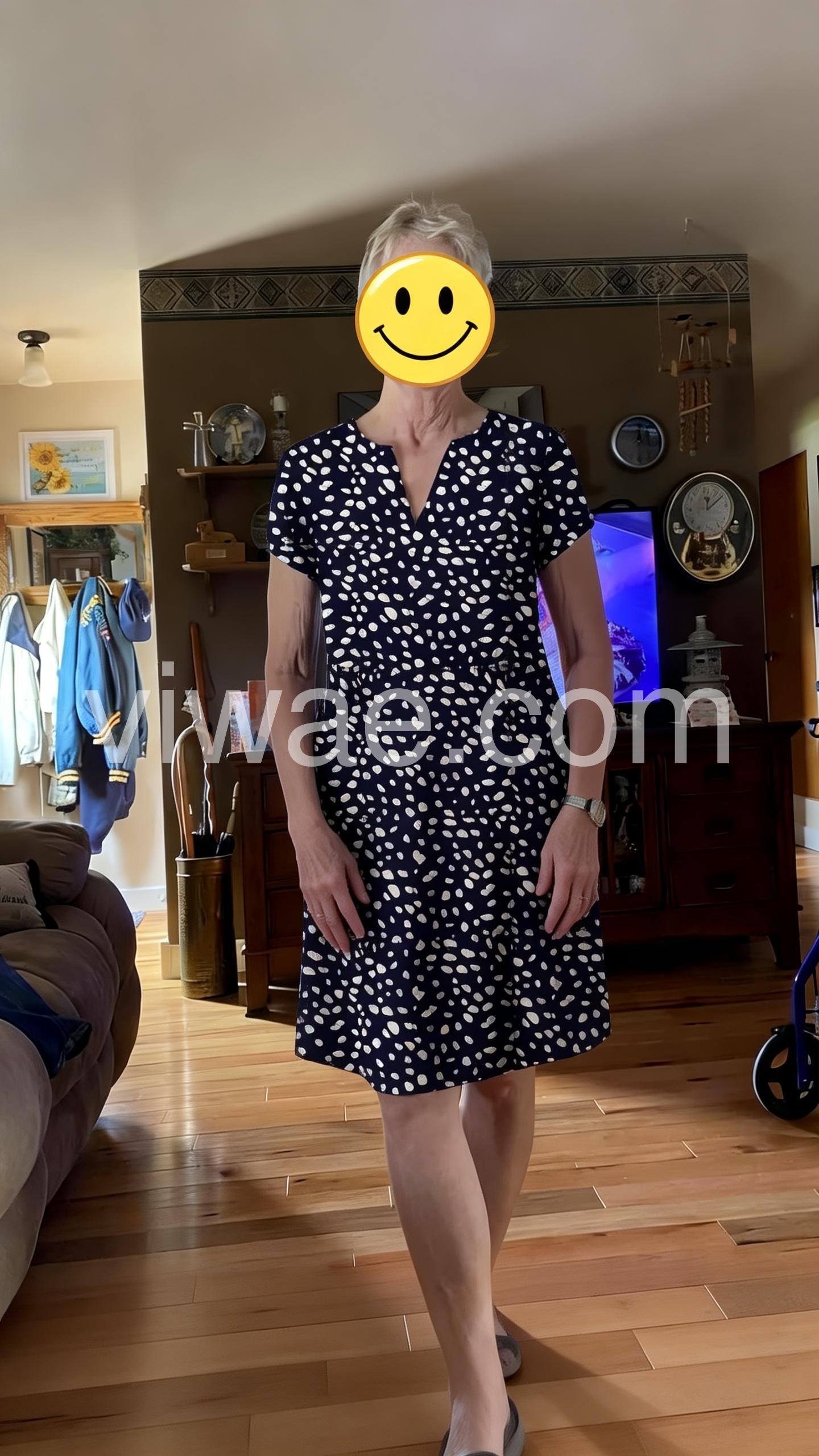This mid-length dress features a navy base with playful white polka dots and a flattering V-neckline. Short sleeves and a relaxed fit make it perfect for warm days. Lightweight fabric ideal for casual outings or brunch. Pair with heels or sandals for a polished look. Timeless style with a cheerful touch.