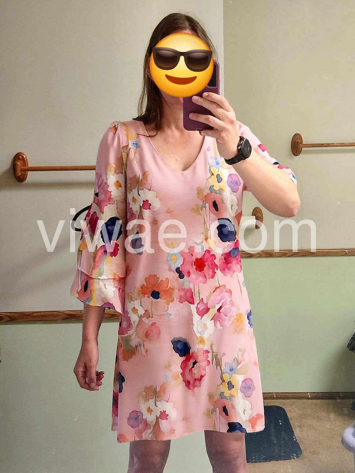 Embrace soft romance and effortless style in this Pink Watercolor Floral 3/4 Sleeve Mini Dress , a dreamy mini dress that captures the beauty of blooming spring. Crafted from lightweight, flowing fabric—likely chiffon or rayon blend—this dress features a delicate watercolor-inspired floral print in vibrant shades of pink, coral, navy, yellow, and white, creating a painterly effect across the soft blush base. The flattering V-neckline adds a touch of elegance, while the short ruffle sleeves bring playful volume and feminine charm. A relaxed, A-line silhouette ensures comfort and ease, making it perfect for casual days, brunches, or warm-weather outings. Paired here with layered bracelets and a pearl necklace, it exudes boho-chic appeal. Ideal for beach trips, garden parties, or weekend strolls, this dress brings a sense of lightness, joy, and timeless femininity to your wardrobe. Let this floral mini dress turn every moment into a gentle celebration of color and style.
