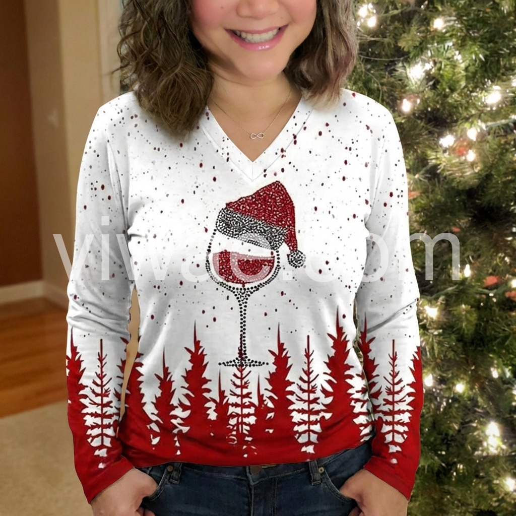 Spread holiday cheer with this long sleeve v-neck top! A dotted mosaic creates a tipsy red wine glass Santa Claus hat print, setting a fun and flirty mood for your next Christmas party.  Red pine trees add the perfect backdrop for any time you need a joyful reminder of your favorite time of year.