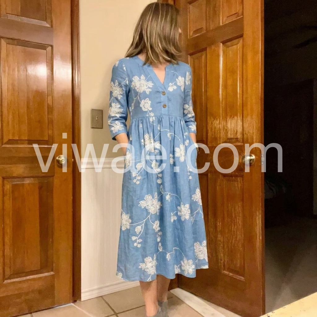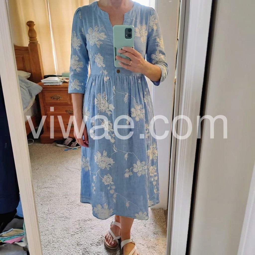 Crafted to solve the "plain linen dress" pain point, this dress is adorned with intricate floral embroidery that adds artistry to everyday wear. The V-neck flatters the bust, while the pleated waist cinches without squeezing.