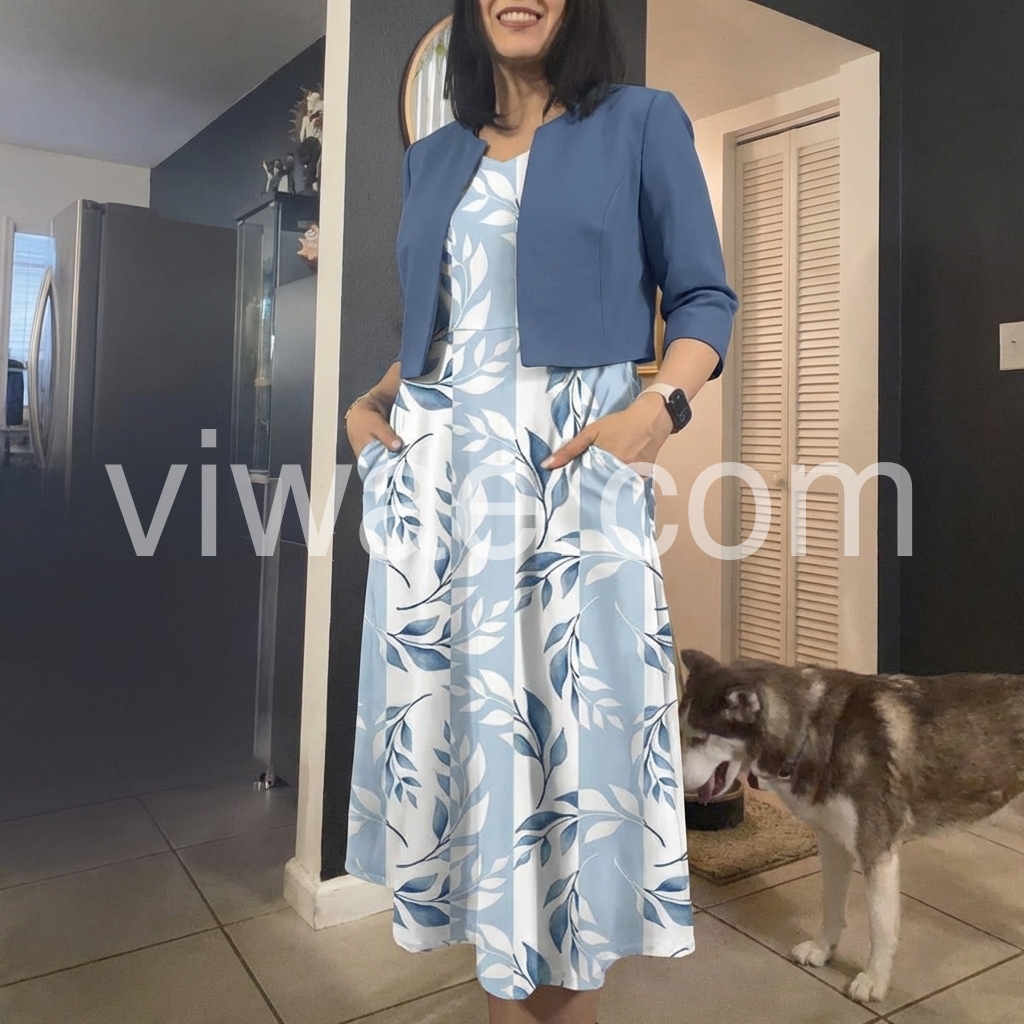 Blue Leaf Print Dress & Cropped Jacket Midi Dress