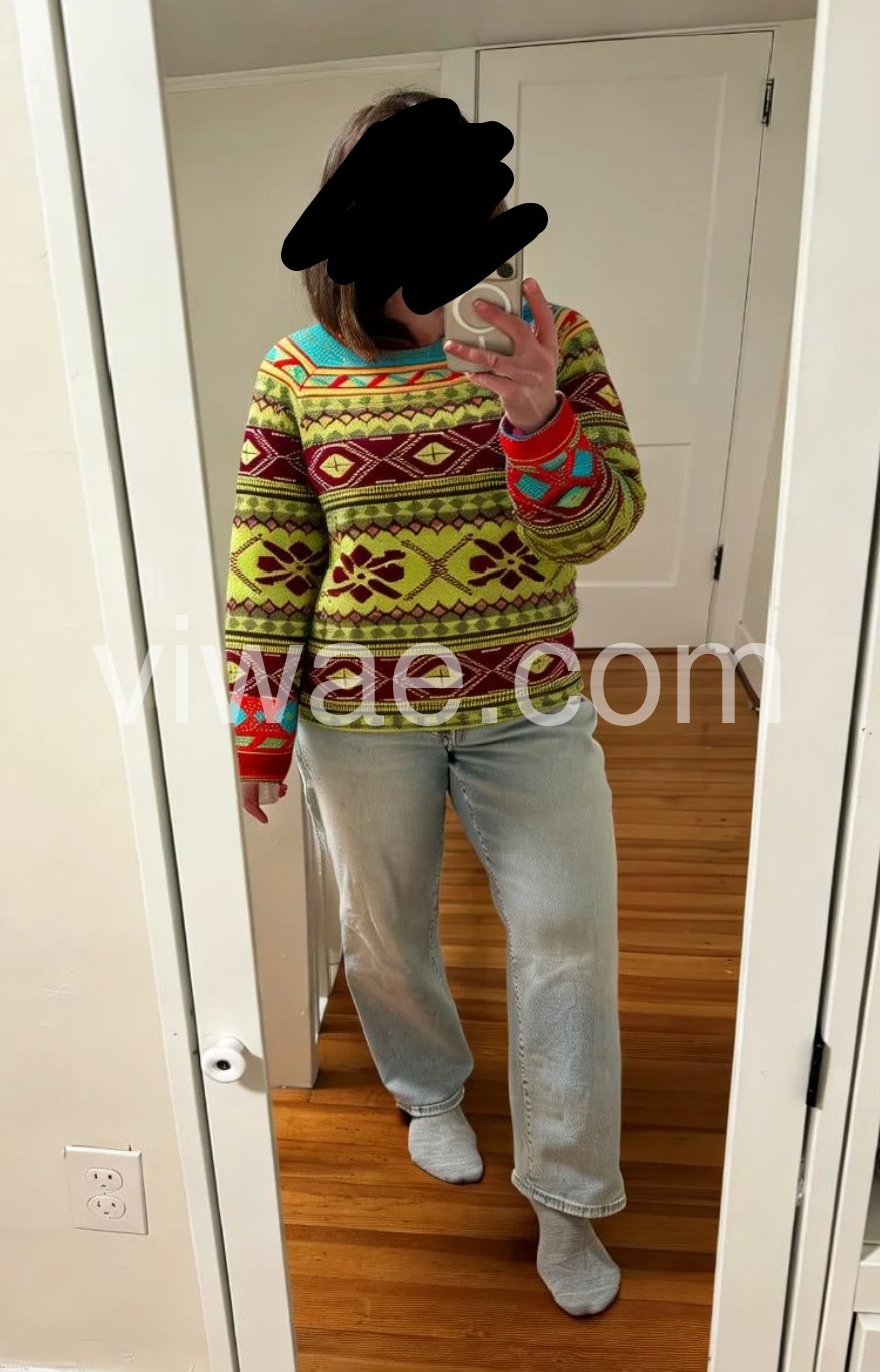 This sweater is such a fun and vibrant addition to my wardrobe! The mix of bright lime green, deep burgundy, and pops of turquoise in the classic fair isle pattern is so eye-catching—you can’t help but smile when you put it on.