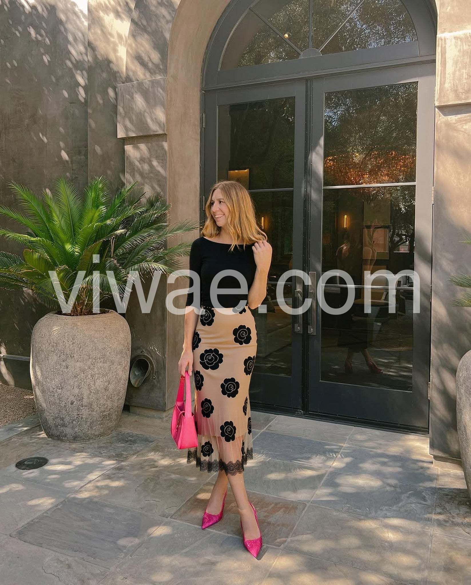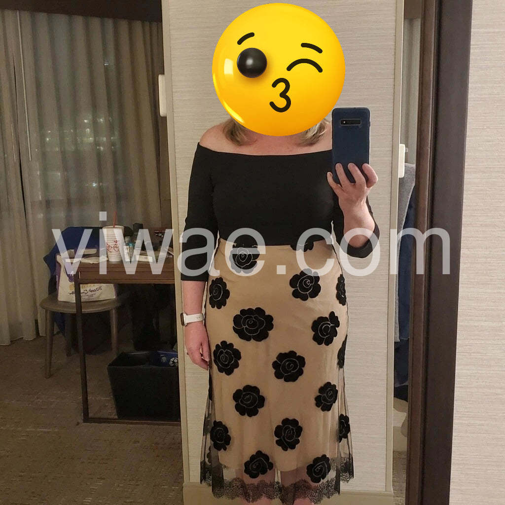 Looks way more expensive than it is! The fabric quality is fantastic. The black flowers on the beige background really pop. It perfectly hugs my curves without being too tight.