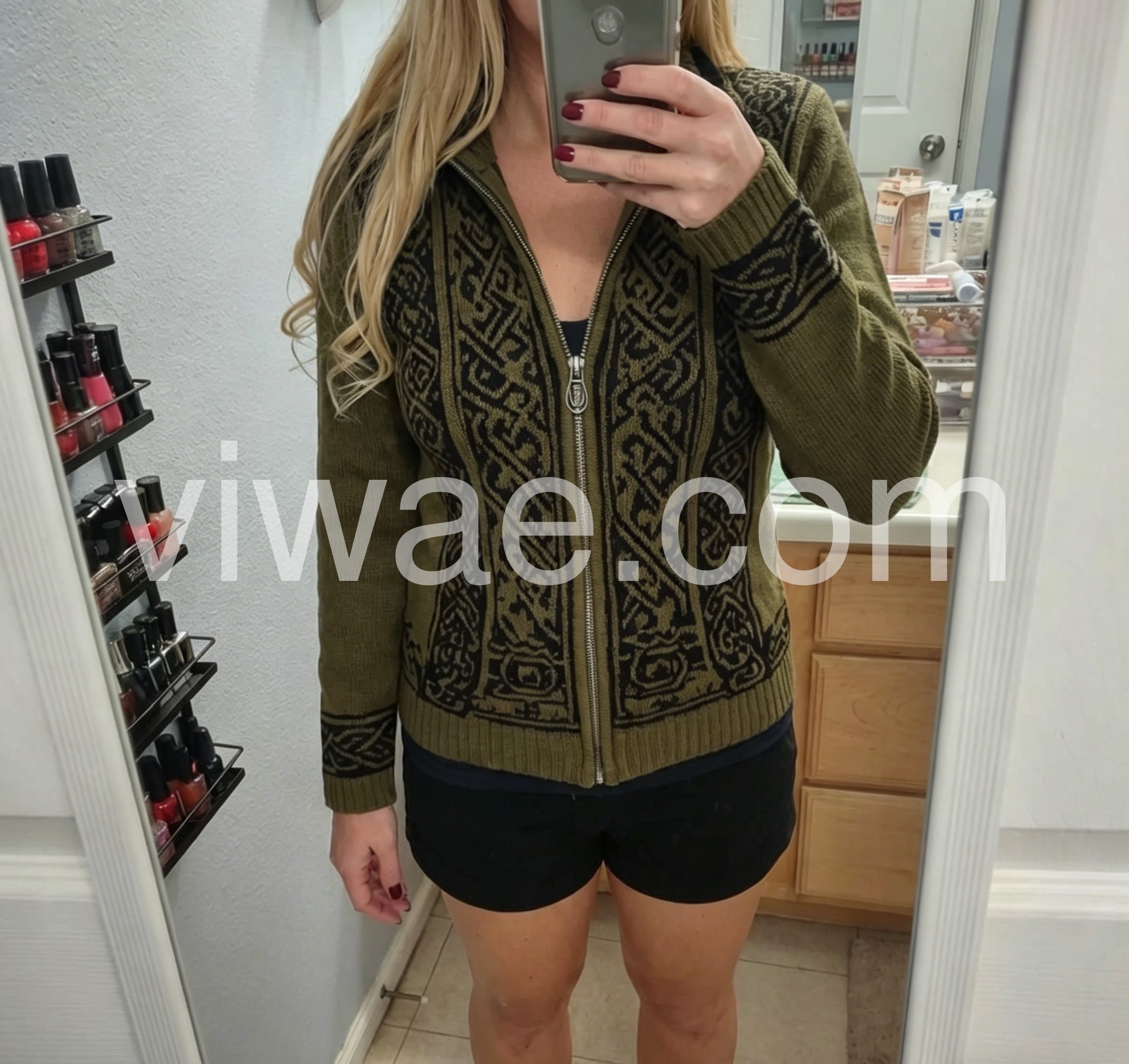 This olive green Celtic-pattern zip-up cardigan is such a standout piece! The thick, cozy knit is warm enough for crisp fall days, and the intricate black tribal-inspired pattern gives it such a cool, edgy vibe. The full-zip front makes it easy to layer, and the ribbed cuffs and hem keep the fit snug. I love pairing it with jeans and boots for a boho-rock look, and it gets compliments every time I wear it. The fabric is soft, durable, and holds its shape perfectly after washes.