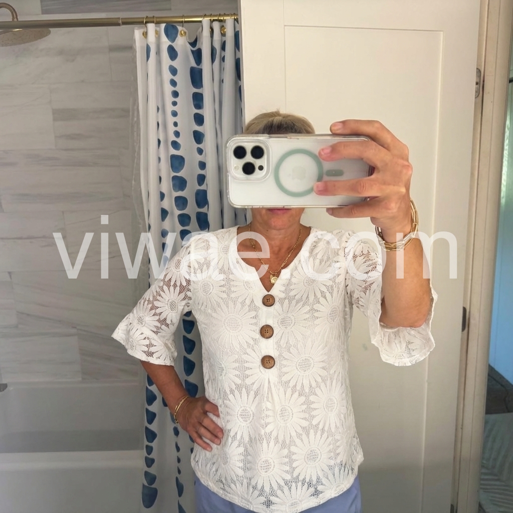This blouse reimagines timeless femininity with intricate daisy-patterned lace. The crisp white openwork fabric creates a delicate, luminous silhouette, perfect for elevating everyday looks.