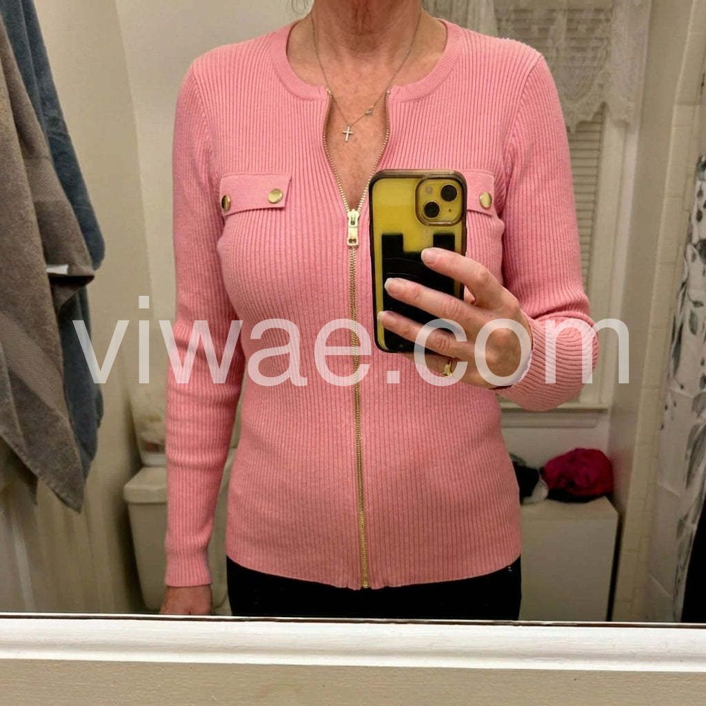 Elevate your wardrobe with our Sweet Pink Plain Zip V-Neck Knit Top. The soft knit material's luxurious feel makes it perfect for all-day comfort, while the modern V-neck and zip design adds a touch of sophistication. Upgrade your style with this classic and versatile top.