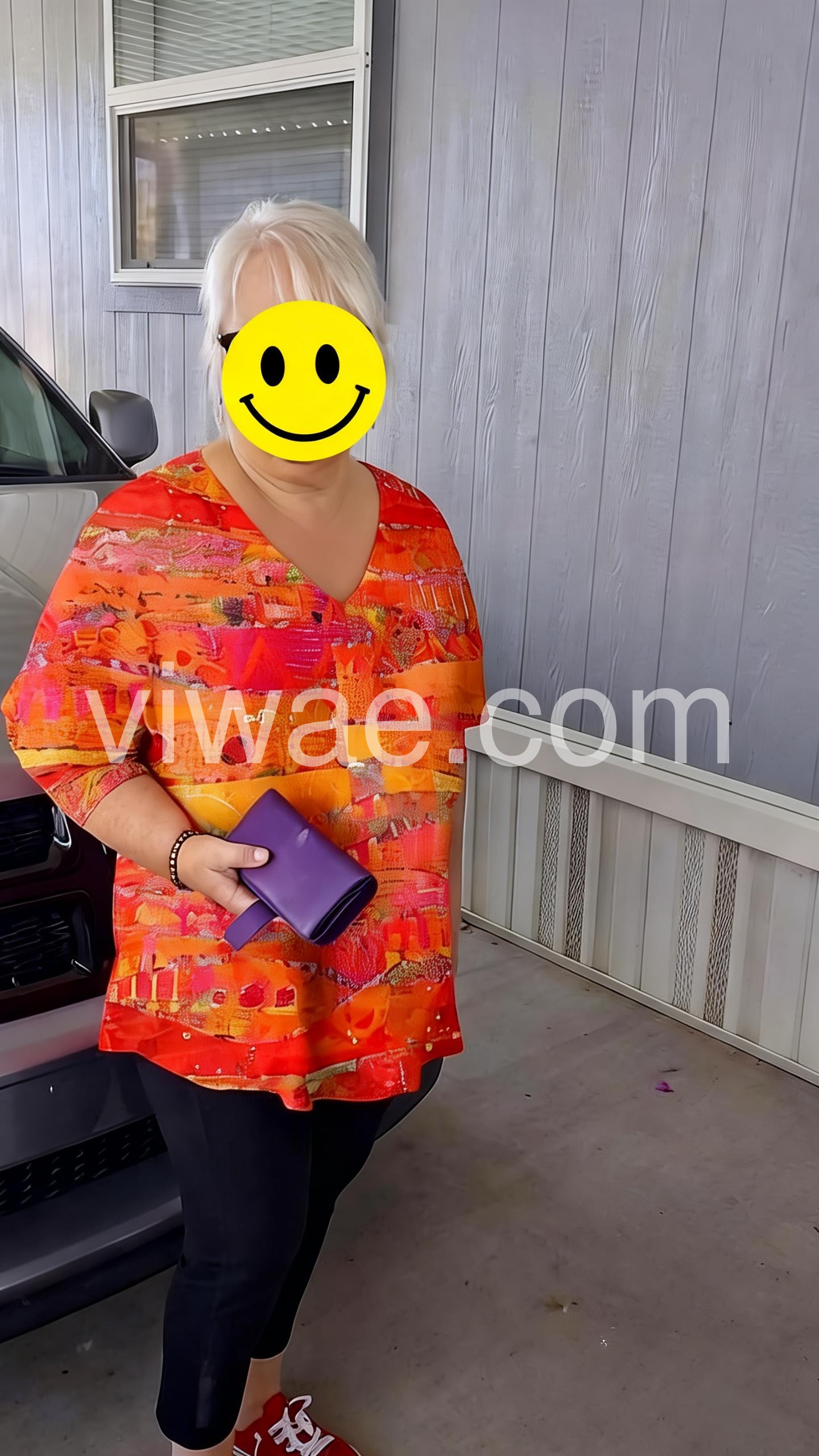 This loose-fit top features a striking abstract pattern in warm red, orange, and pink tones. V-neckline and three-quarter sleeves for comfort. Lightweight fabric with a relaxed drape. Perfect for making a statement in casual or resort wear. Effortlessly stylish and eye-catching.