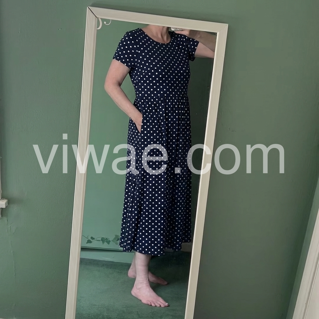 Wore this out to a weekend brunch and got so many compliments. The polka dot print is classic and never goes out of style. The fact that I can slip my phone into the deep pocket makes it a 10 out of 10.