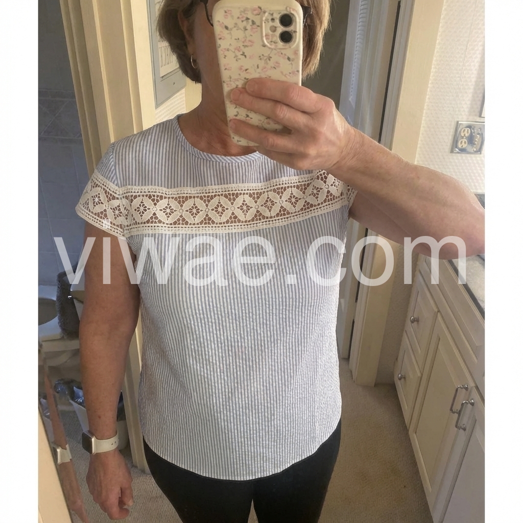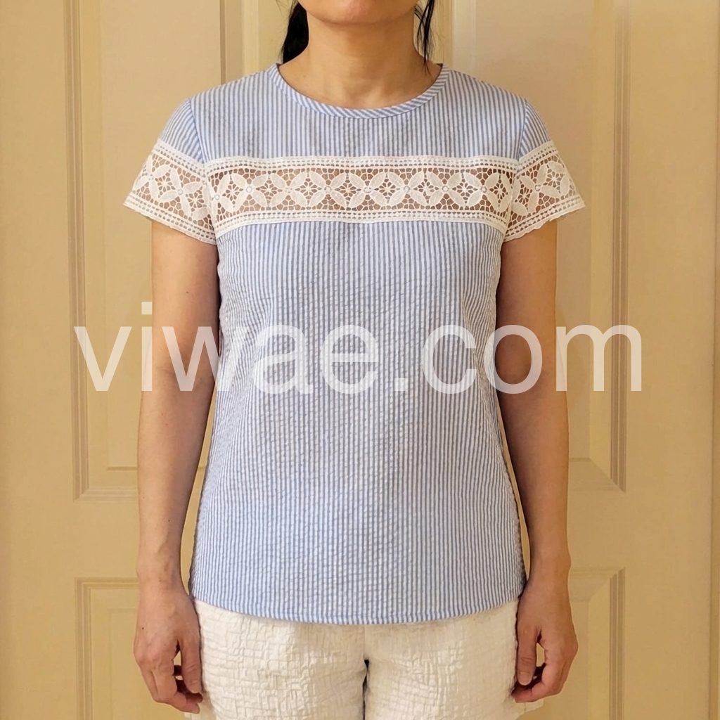 This short-sleeve top features a delicate white lace panel across the chest and sleeves. Made from soft, textured fabric with vertical stripes for a subtle pattern. Perfect for casual summer days or beach outings. Pair with shorts or jeans for a stylish look. Effortlessly chic and breathable.
