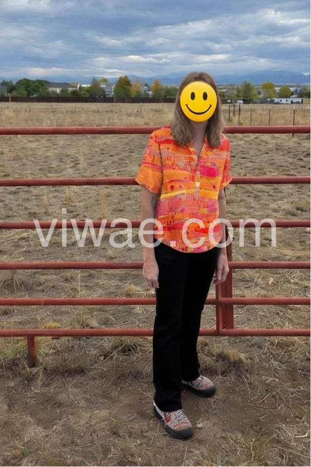Perfect lightweight top for hot summer days. The bright orange and pink tones really compliment a tan. It is well made and the buttons are sewn on securely.