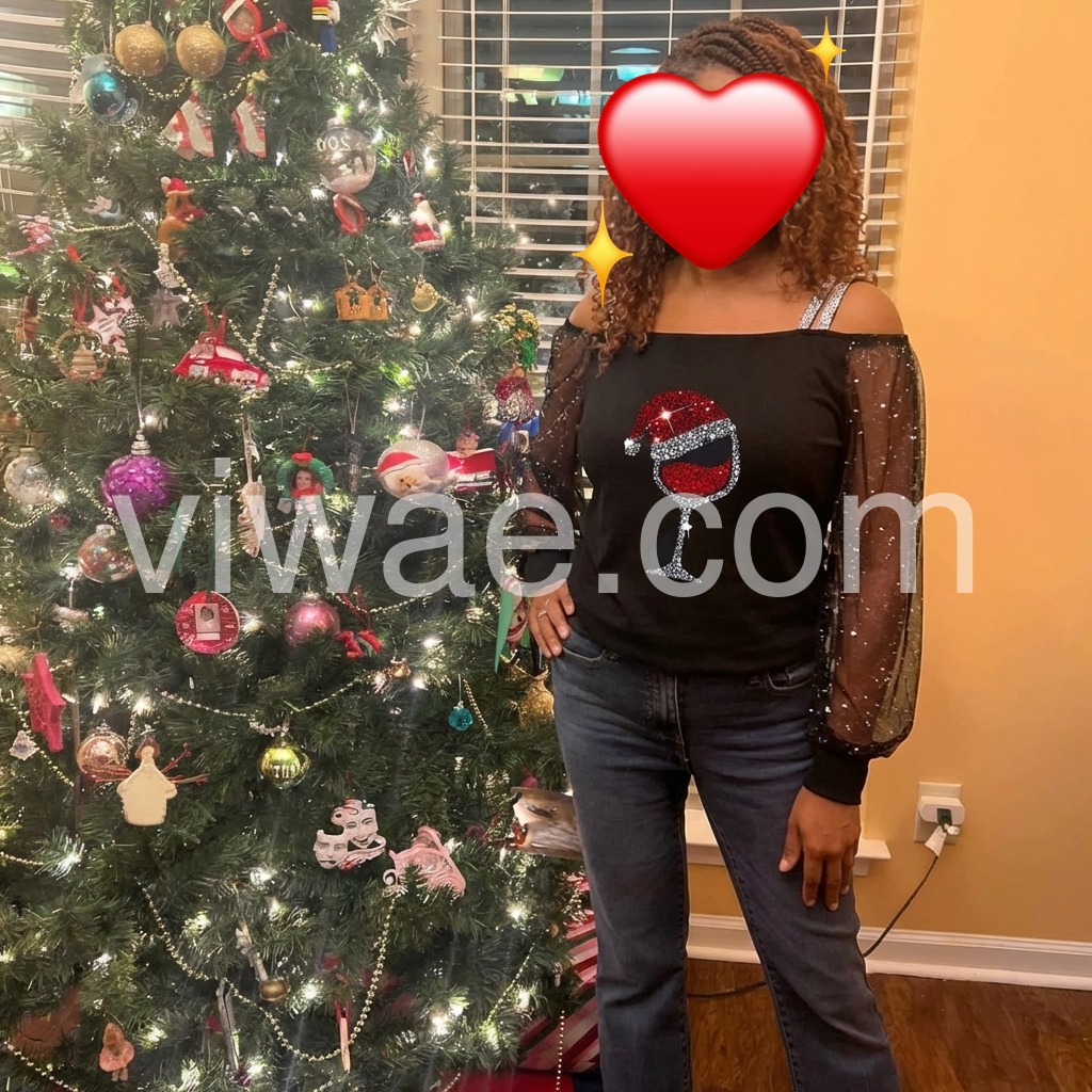 This elegant long-sleeved holiday Christmas shirt features a glittering print of a tipsy red wine glass with a Santa Claus hat, spreading the holiday cheer with a super-fun vibe, ready for par-tay good times! This black off-shoulder asymmetrical shirt features sheer long sleeves elevating this top to a luxe look for any date night. Machine wash cold tumble dry low to medium heat. Iron if needed or lay flat to dry.