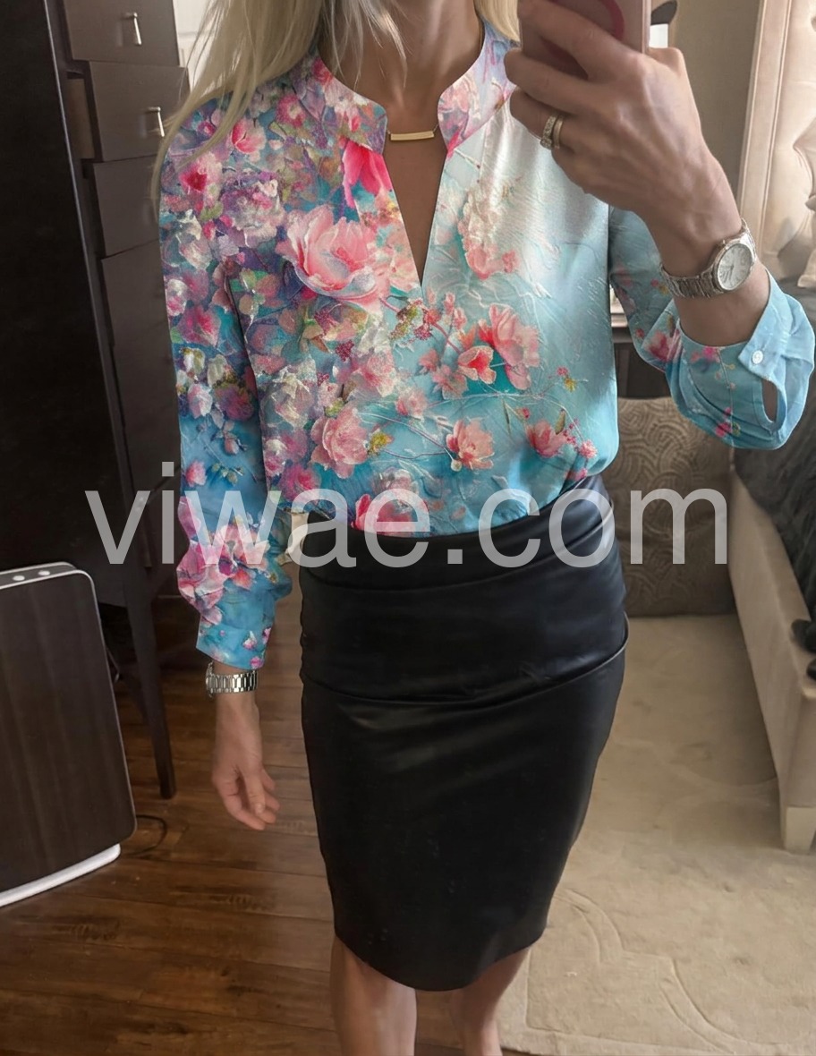Style# 1544516Bring a burst of elegance to your wardrobe with this Fresh Turquoise Floral Print Top, a stunning piece that blends vibrant floral artistry with luxurious fabric. Crafted from a smooth, satin-like material—likely silk or satin blend—this blouse features a rich turquoise base adorned with a lush watercolor-inspired floral pattern in soft pinks, coral, white, and hints of green. The bold yet romantic design creates a dreamy, garden-fresh look perfect for warm weather. A subtle V-neckline adds a touch of sophistication, while the long sleeves with buttoned cuffs offer versatility and a polished finish. The relaxed, slightly flowy silhouette drapes beautifully over the body, making it ideal for pairing with jeans, tailored pants, or high-waisted skirts. Styled here with denim and layered jewelry, it effortlessly balances casual comfort with refined style. Whether you're heading to a daytime event, brunch, or a summer outing, this floral blouse brings grace, color, and timeless charm to every look.