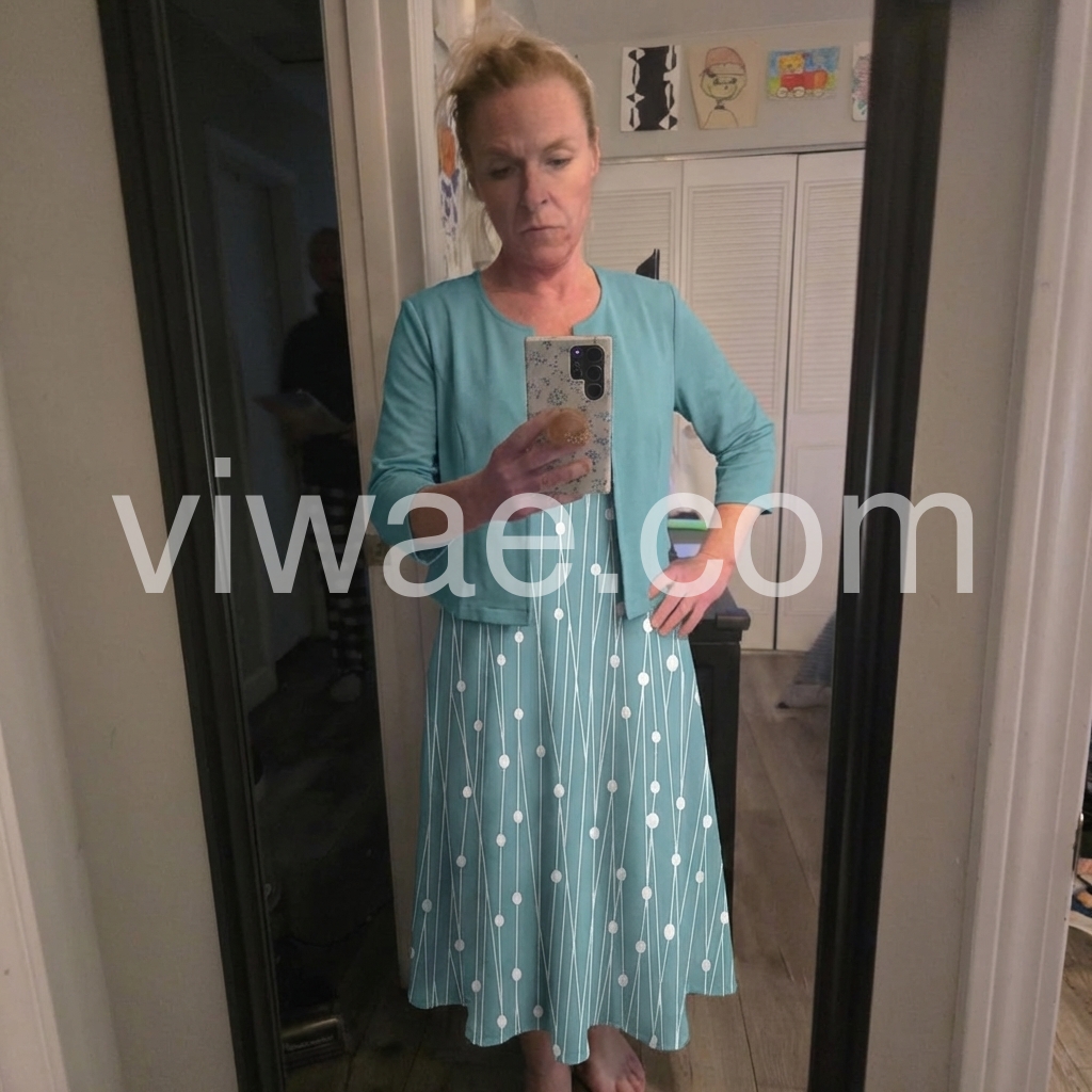 This flowing midi dress with white polka dots on a turquoise background. Paired with a matching short sleeve jacket for a polished look. Comfortable and stylish for casual outings or garden events. Lightweight fabric perfect for warm days. Effortlessly chic and feminine.