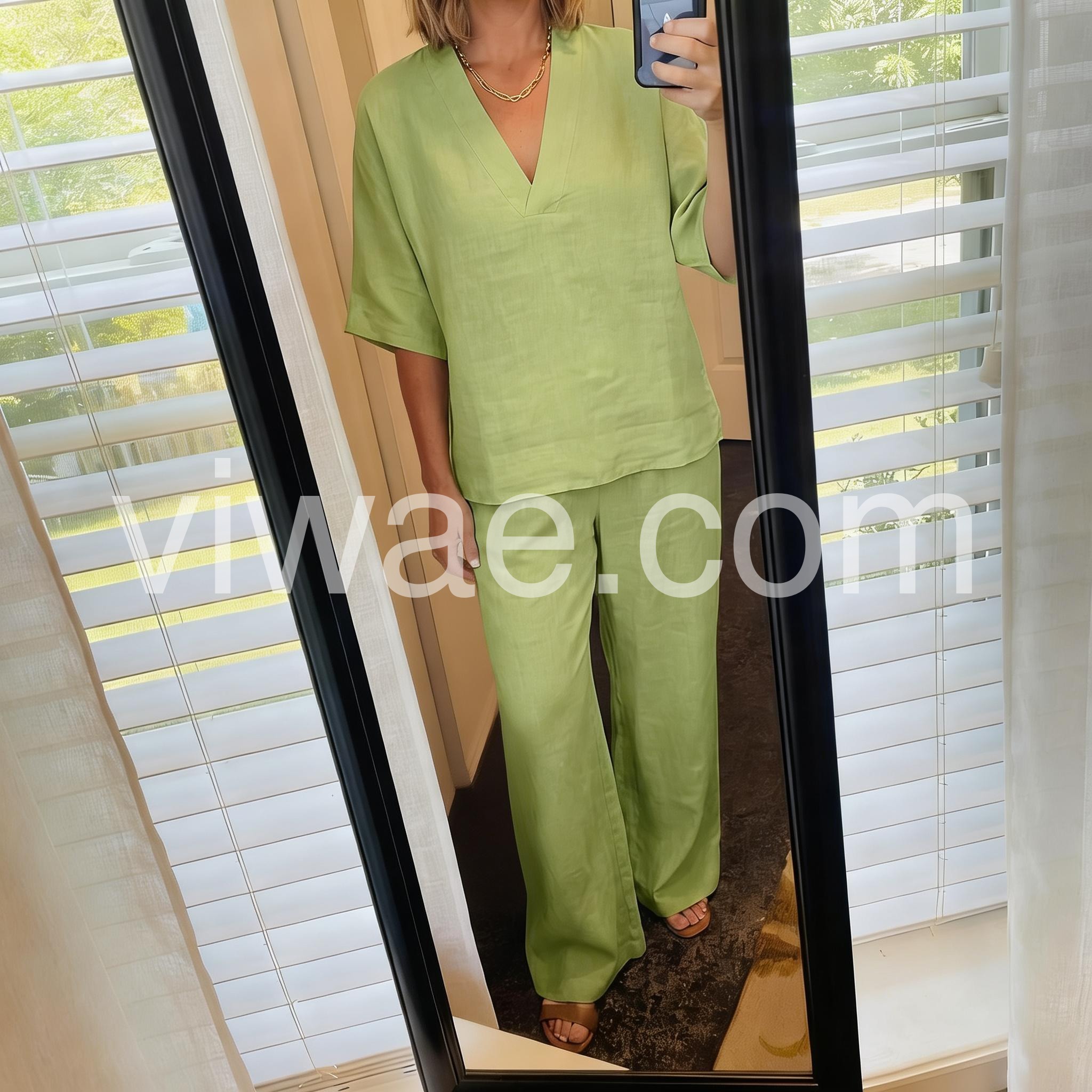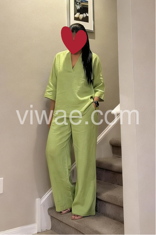 This coordinated set features a relaxed V-neck top and wide-leg pants in soft, breathable linen. The solid lime green hue offers a fresh, natural look. Perfect for warm weather and casual wear. Ideal for beach days or effortless everyday style. Comfortable and elegantly simple.