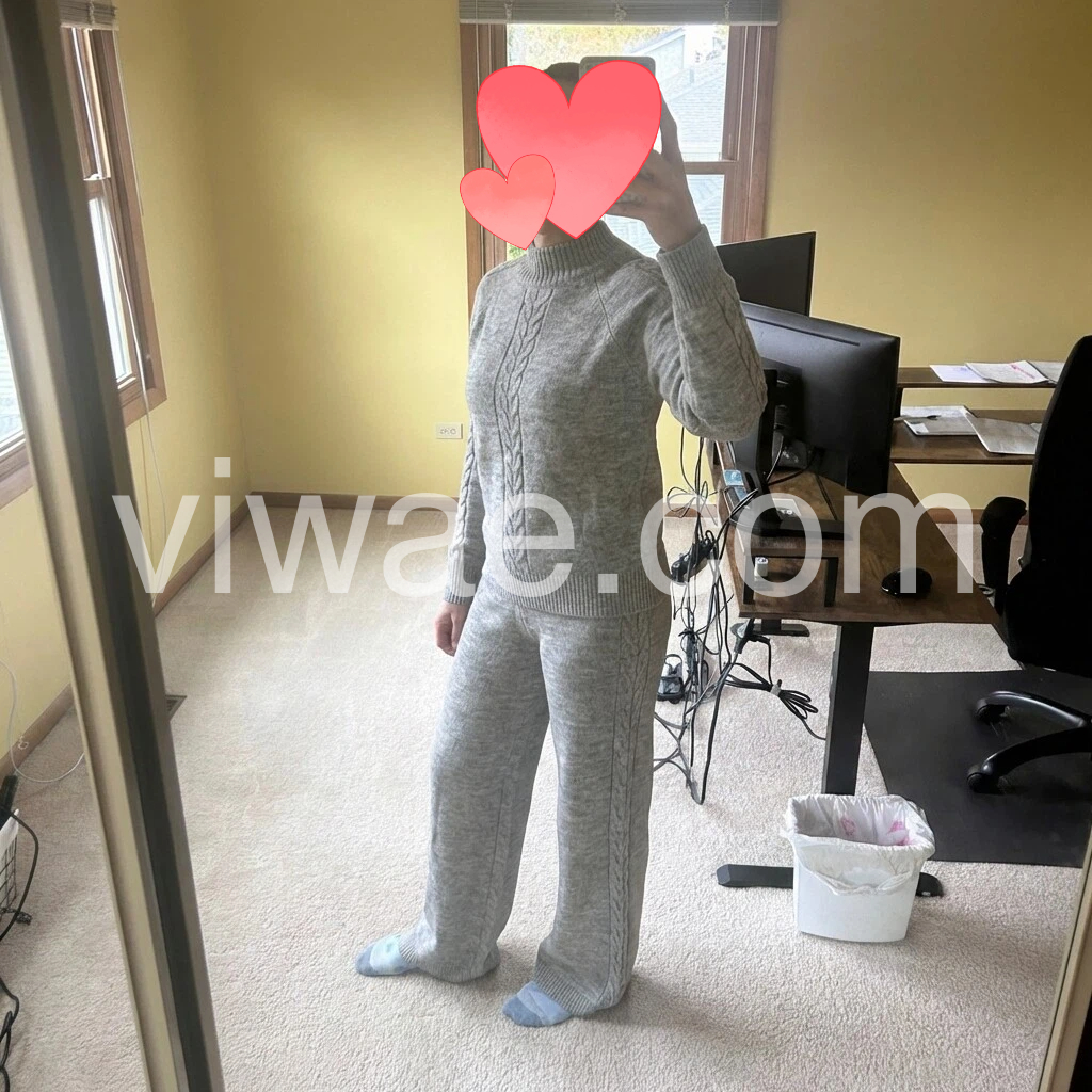 This is such a comfortable knit set. The sweater is cozy and the high neck cable pattern is beautiful. The matching pants fit nicely and feel smooth and soft. I’ve worn it around the house and also for running errands always looks great. It matches the listing pictures perfectly and I’m very happy with it.
