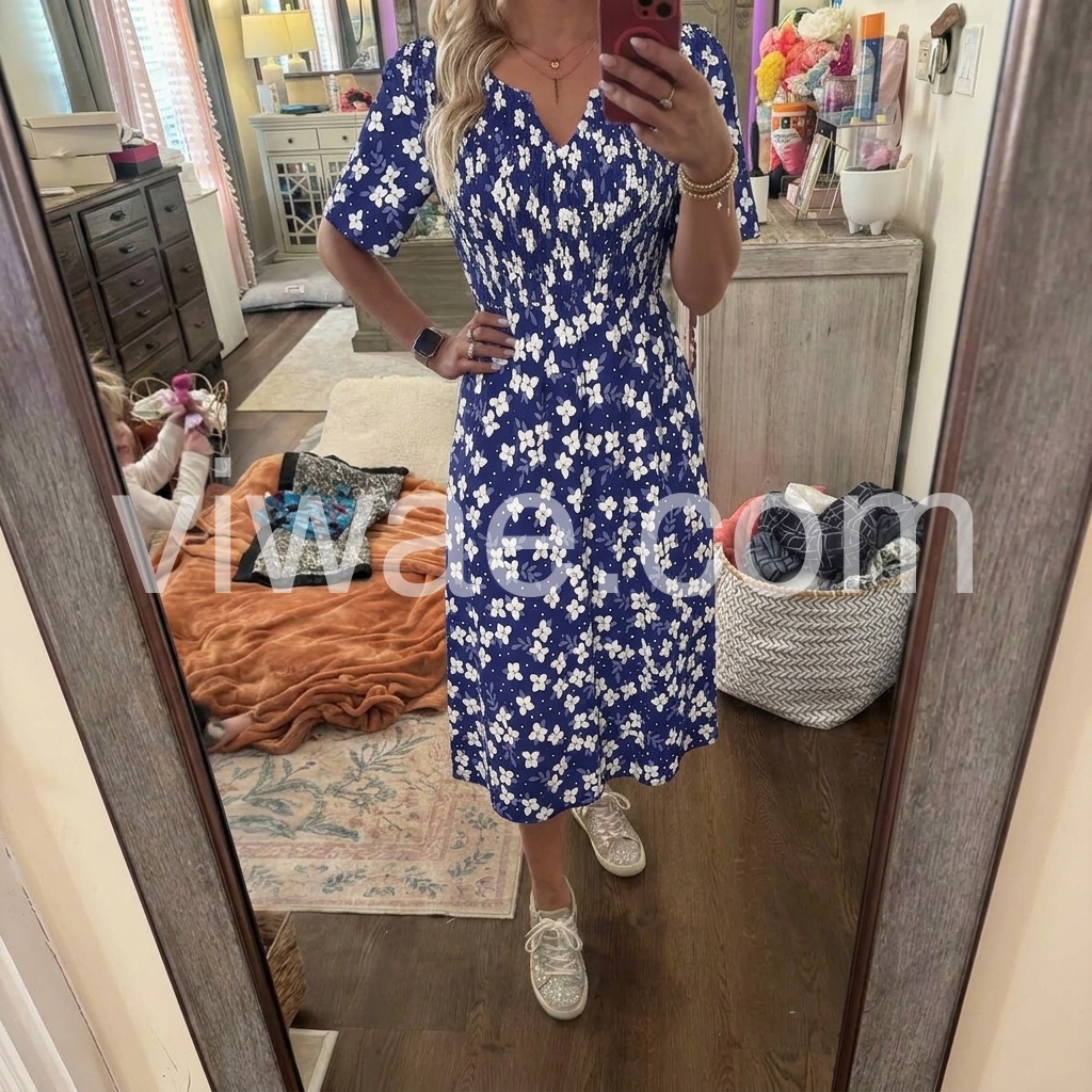 This dress solves the “cute but comfortable” dilemma with ease. The ditsy white floral print on a navy base feels fresh and summery, while the smocked waist creates a flattering silhouette. The gathered detail cinches the waist without feeling tight.