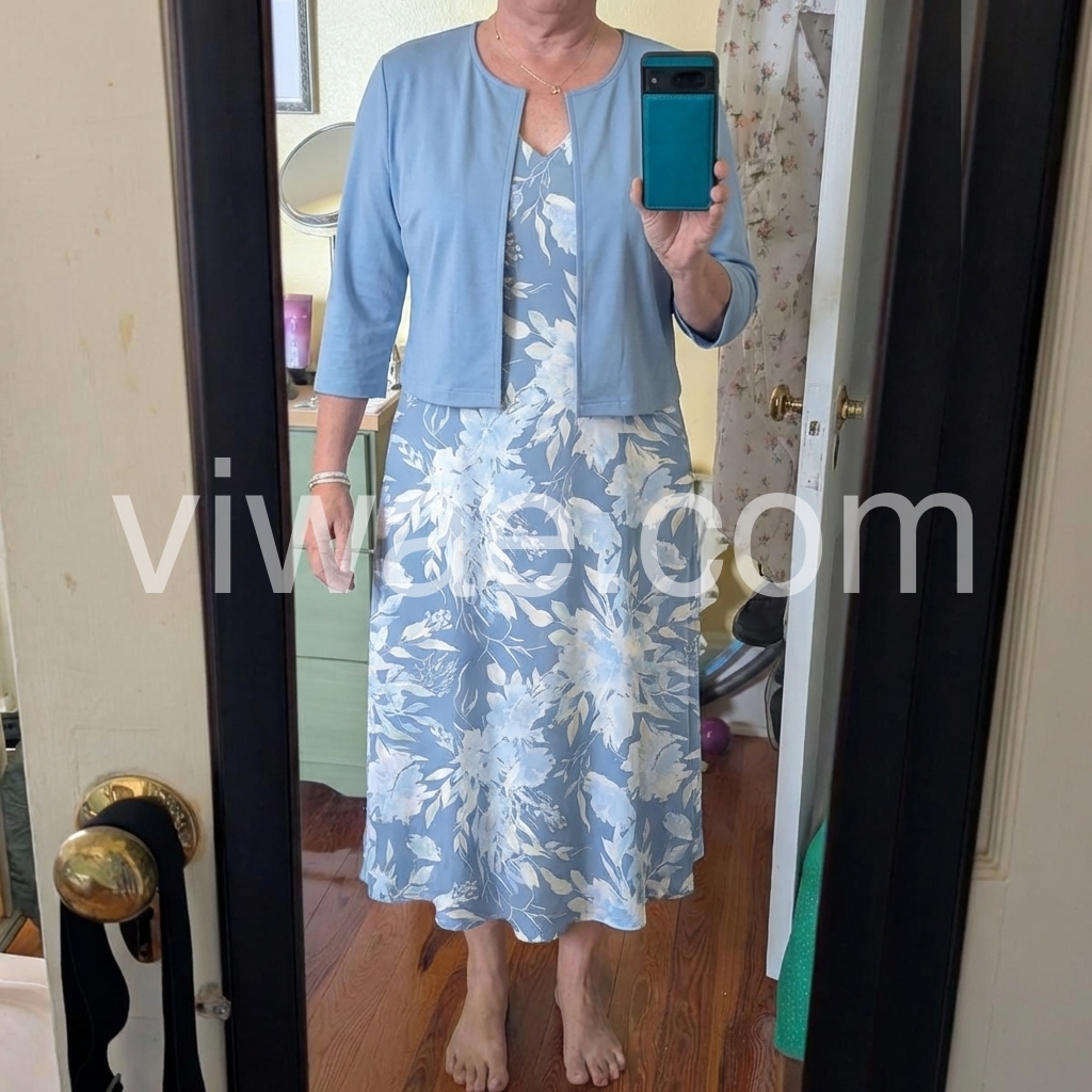 Absolutely gorgeous. The combination of the solid jacket and the floral dress is perfectly balanced. I washed it on the delicate cycle and hung it to dry, and it came out looking brand new without needing to be ironed. Very pleased with this purchase.