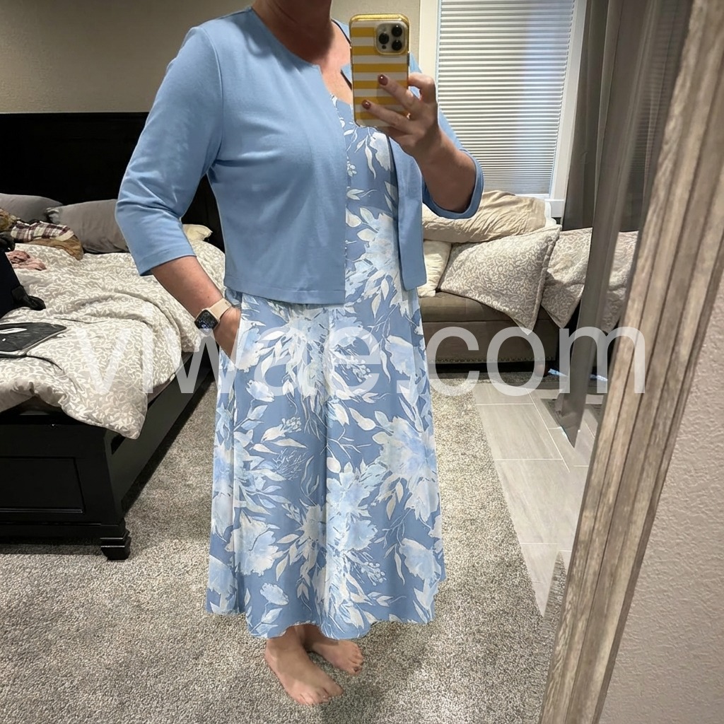 I absolutely love this dress! The light blue color is so perfect for spring and the floral pattern is beautiful. The best part is that it has pockets! It fits true to size and the matching cardigan makes it perfect for church or a nice brunch. Highly recommend!