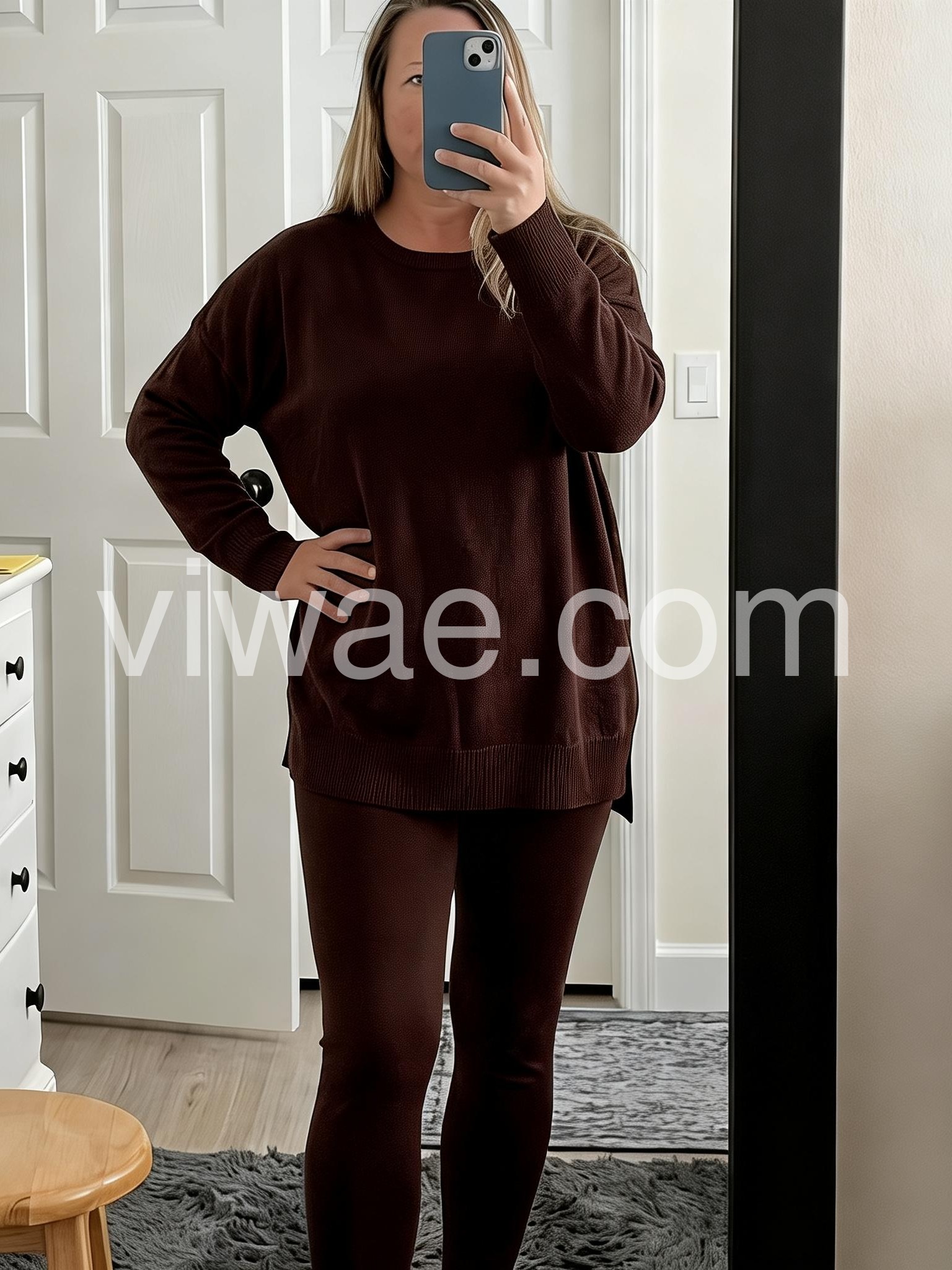 Comfy Round Neck Long Sleeve Side Slit Hem Two Piece Set