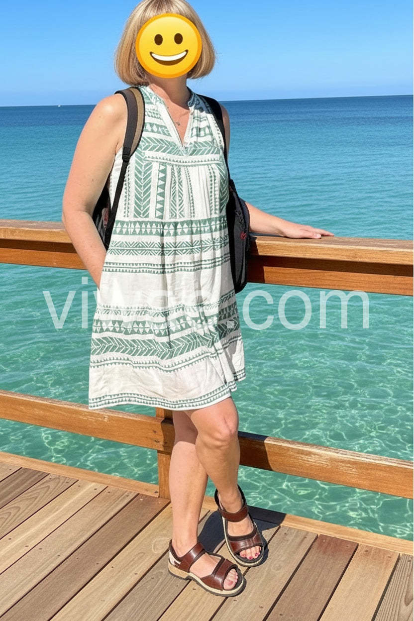 Absolutely love this dress! The green geometric pattern is so cute and perfect for summer. It is incredibly lightweight and airy making it my go-to for hot days.