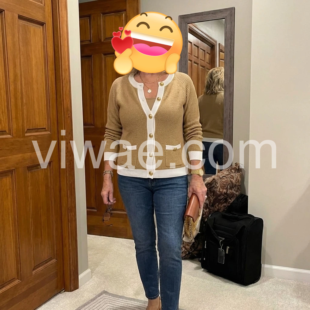 I’m obsessed with this cardigan! The quality is way better than I expected—no loose threads, and the knit is smooth and durable. The camel color is warm and timeless, and the white trim makes it look so polished. The gold buttons are sturdy and stylish, and the fit is true to size. It’s versatile enough to dress up with a skirt for work or dress down with jeans for the weekend. I’ve gotten so many compliments on it already!