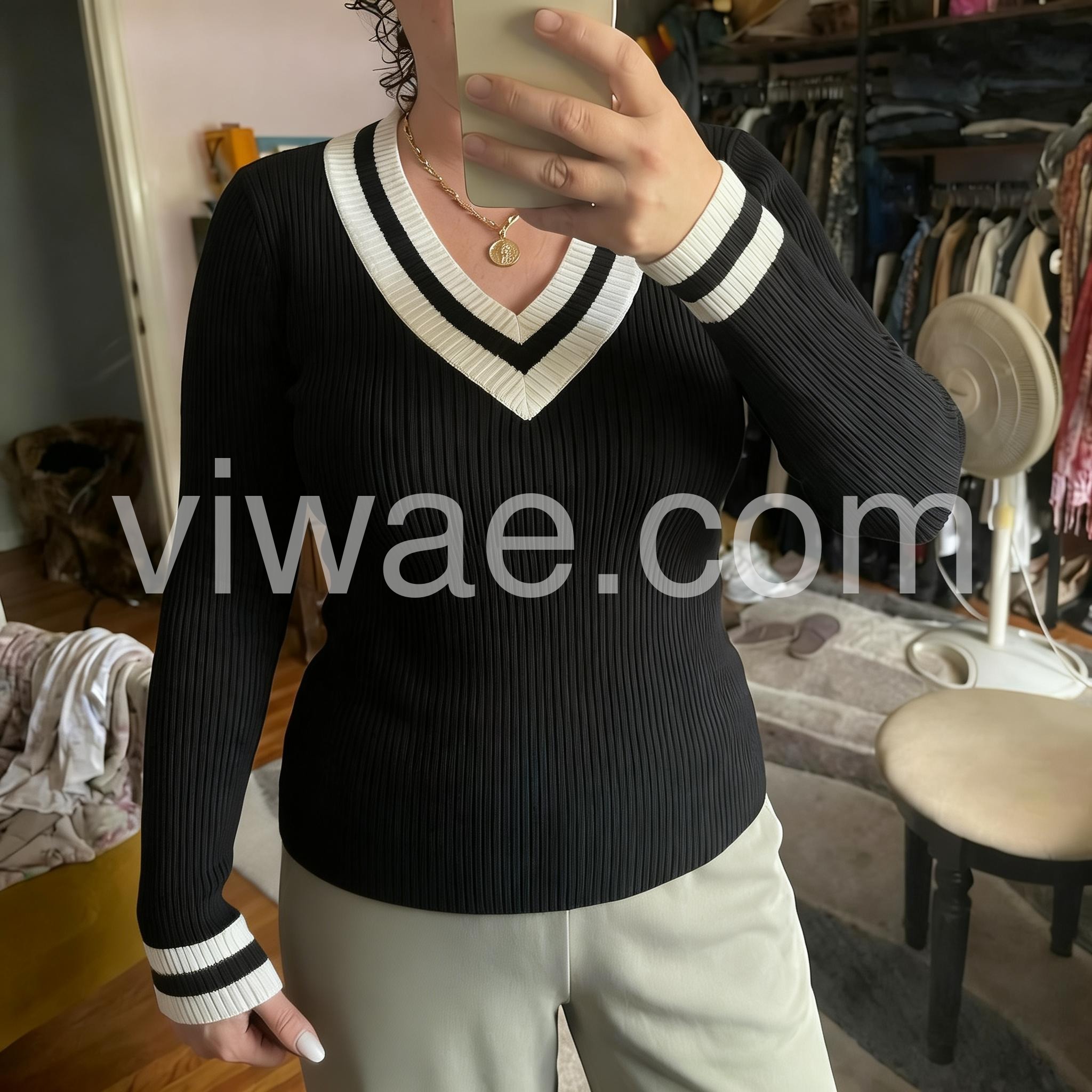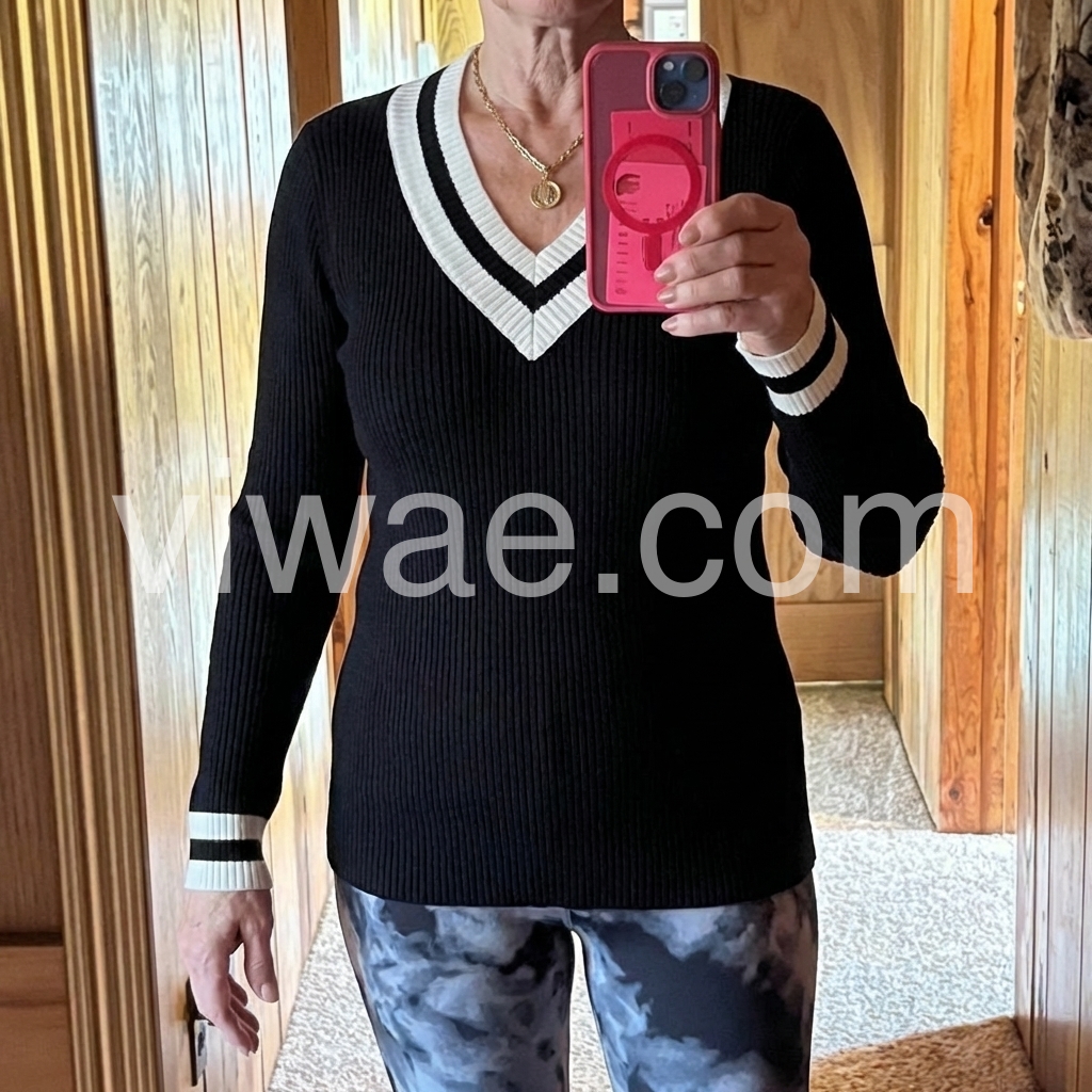 I’m obsessed with this design! The contrasting stripes at the collar, cuffs, and hem give it such a chic, timeless vibe without looking overly busy. The fit feels smooth and well-shaped, and the long sleeves are perfect for cooler weather. I also appreciate how the sweater holds its form after wearing, so it doesn’t look messy. It’s become one of my go-to pieces already.