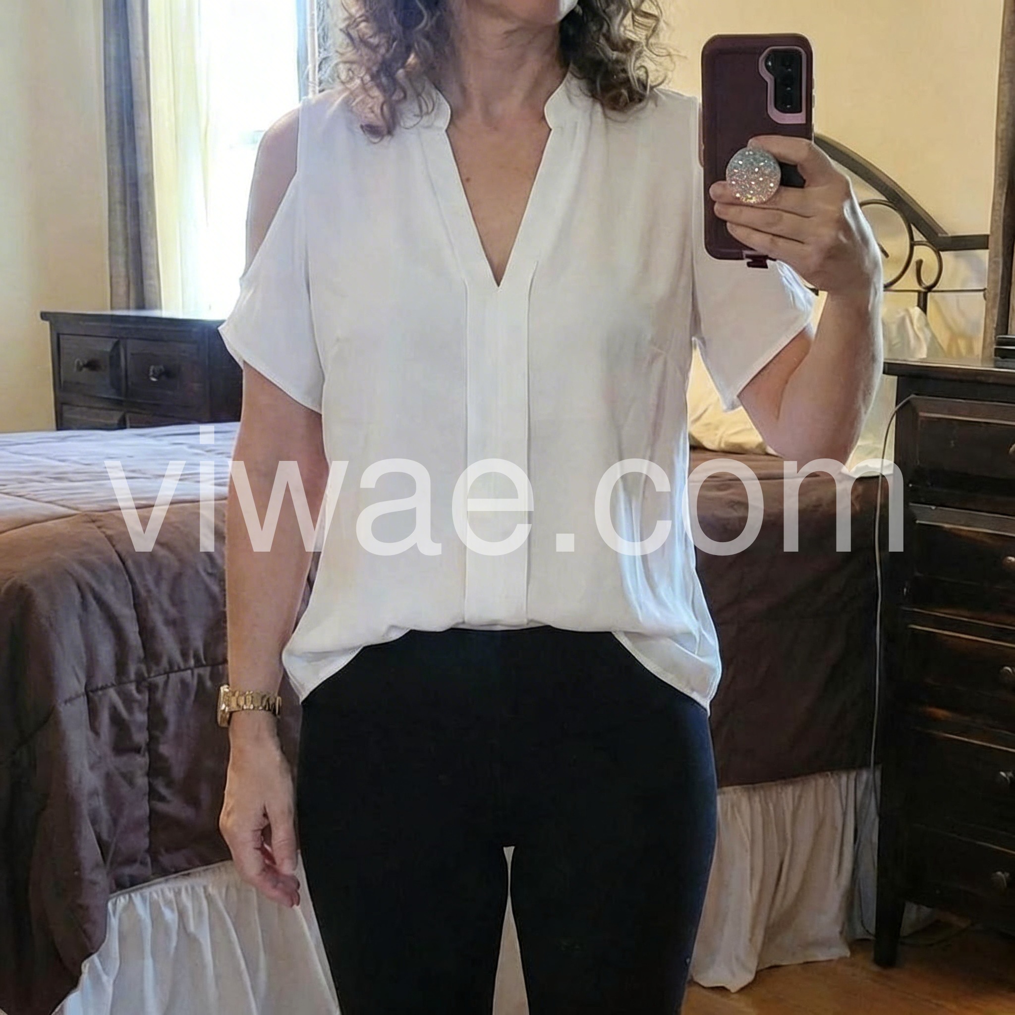 This shirt really flatters my figure. I love loose-fitting shirts, and even though the fabric is a bit thin, it has a great texture. Plus, it always makes me feel like it’s hiding my flaws—really.