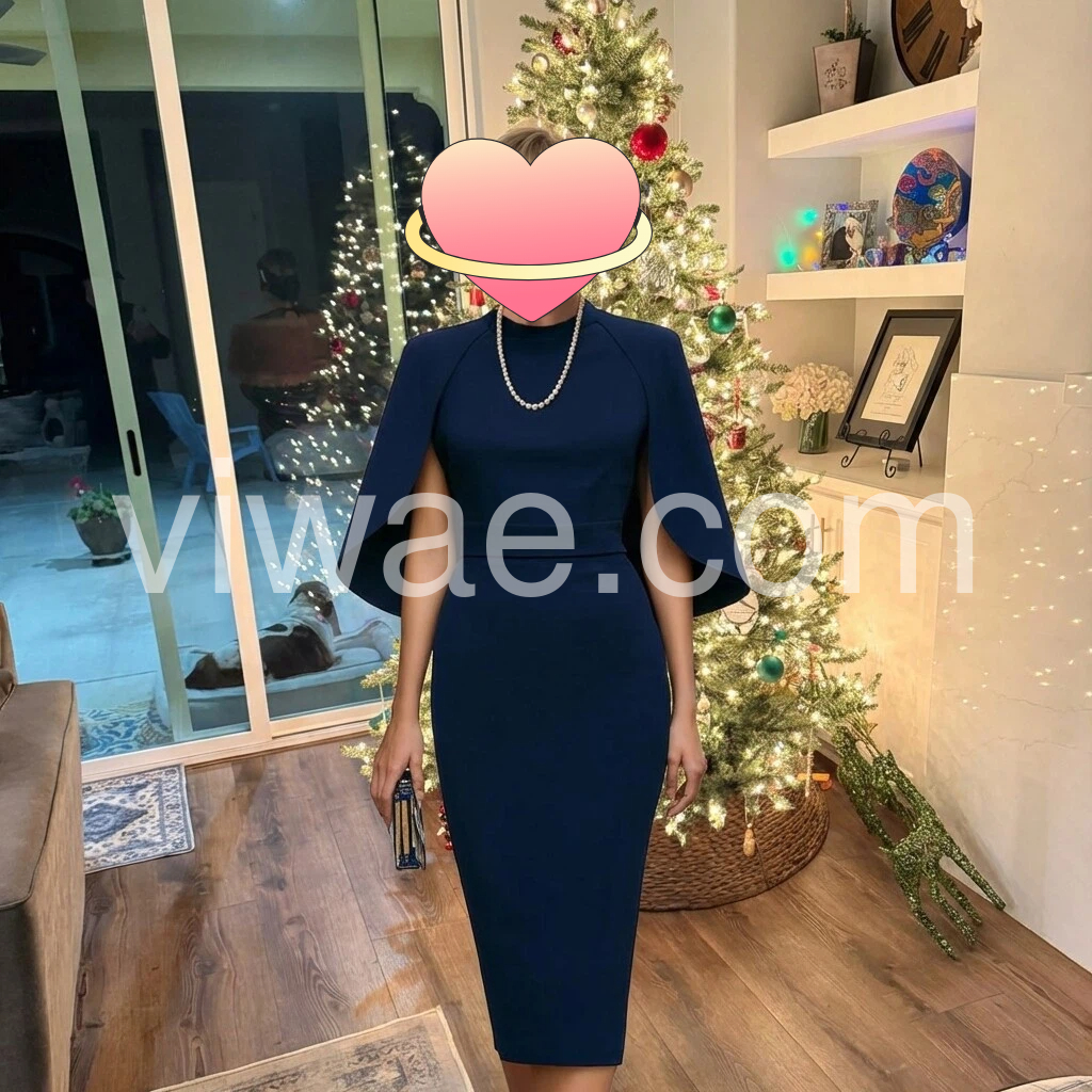 I absolutely love this dress! The navy color is elegant and the fit is very flattering. The cape flared sleeve style adds a refined touch and makes it look dressy without being uncomfortable. I also like the clean neckline and the way the waist is shaped. It feels like good quality and looks exactly as pictured—perfect for holiday events and special occasions.