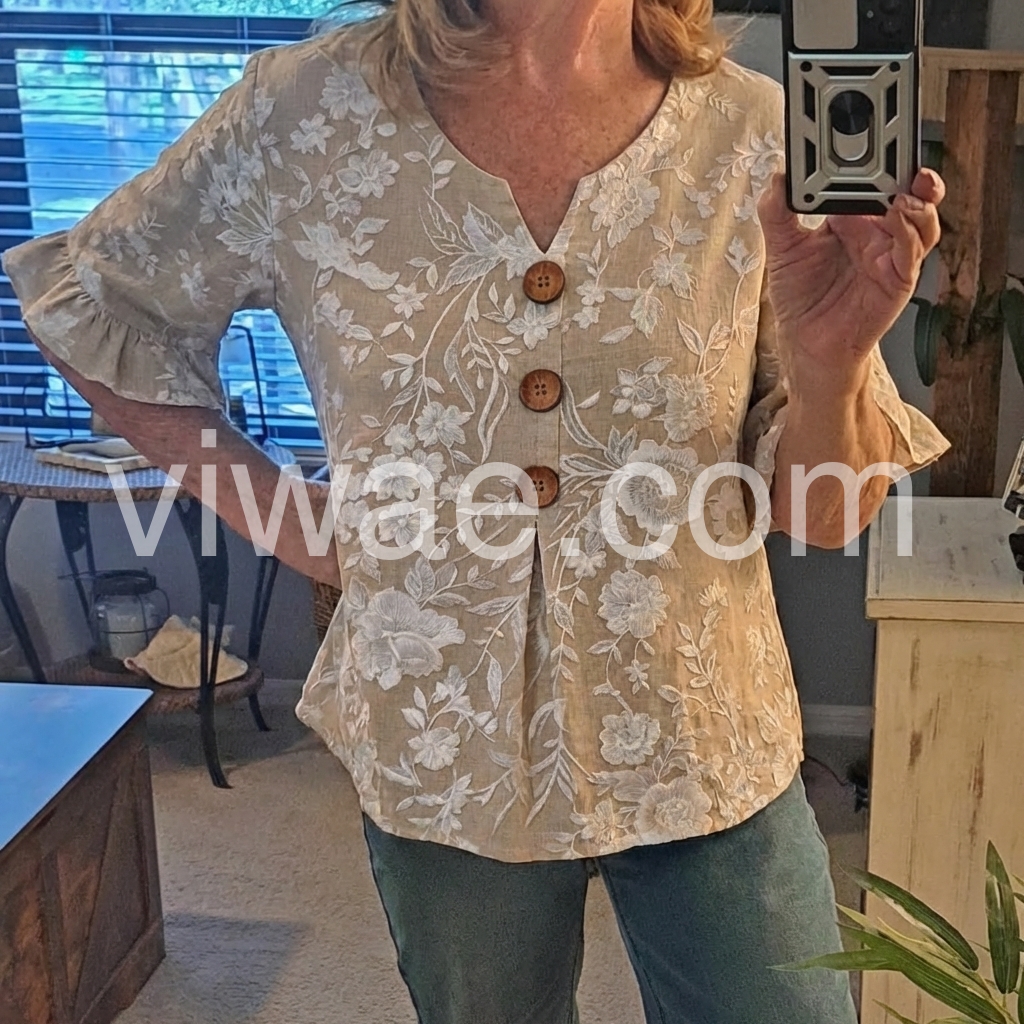 This V-neck top features delicate white floral Print on a soft beige base. Front button closure with wooden buttons and flared ruffle sleeves. Lightweight fabric perfect for warm days. Relaxed fit with a feminine touch. Ideal for casual wear or resort style.