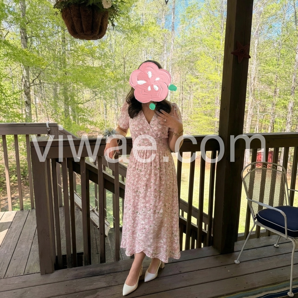 This mid-length dress features a soft pink base with delicate white floral prints. V-neckline and short flutter sleeves add feminine charm. Wrapped front design with a defined waist for a flattering fit. Lightweight fabric perfect for warm days. Ideal for brunches, garden parties, or casual outings.