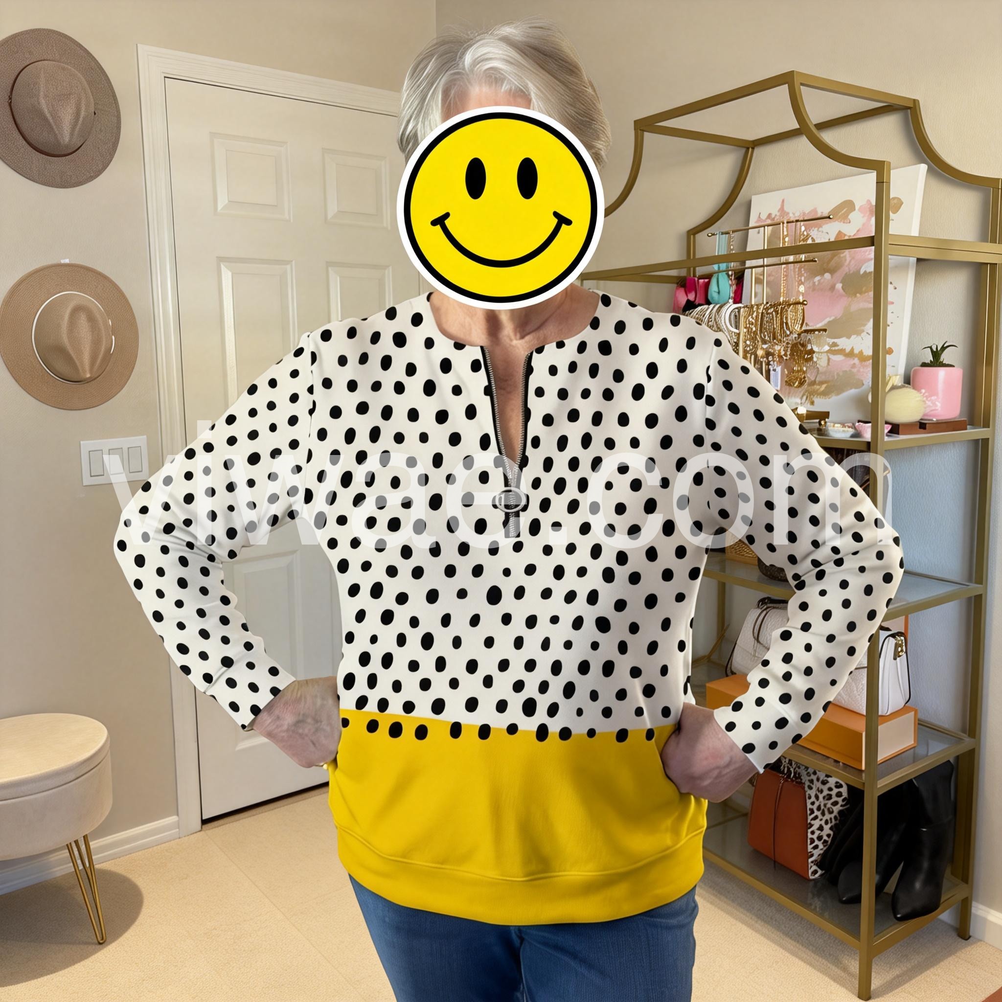 I absolutely love this top! The black and white polka dots are classic, and the yellow color block at the bottom adds such a fun pop of color. The zipper at the neckline is a cute detail. Fits true to size!