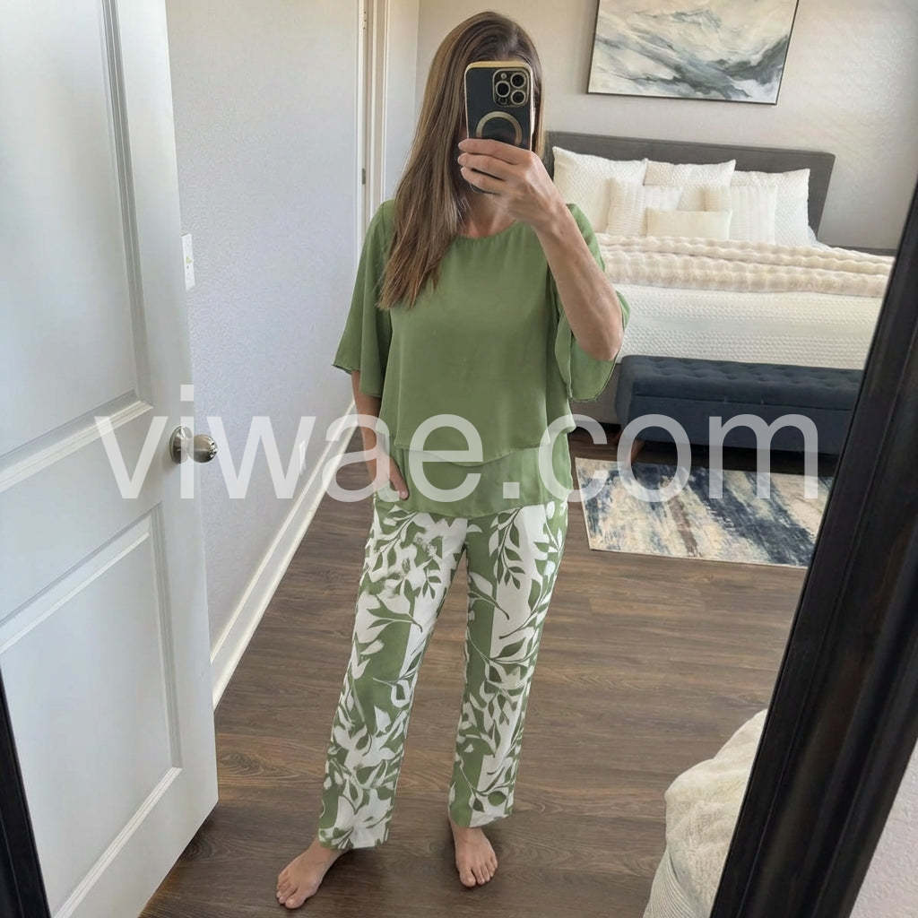 I absolutely love this two-piece set! The flowy green top is so flattering and completely hides my tummy, while the leaf print pants are incredibly comfortable. True to size and perfect for my upcoming cruise.